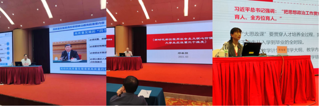 南华大学党委书记高山教授、重庆师范大学原党委书记邓卓明教授、湖南女子学院校长何旭娟教授、江苏大学党委副书记李洪波教授、西华大学党委副书记张力教授、教育部高校思想政治工作队伍培训研修中心(扬州大学)主任叶柏森教授分别以《高质量发展背景下高校思想政治教育的前沿与思考》、《新时代新征程用社会主义核心价值观培养大学生应注重三个维度》、《“大思政课”实践教学改革的探索与思考》、《深化“三全育人”综合改革,推进“一站式”学生社区建设》、《新时代构建深度融合的“三全育人”新机制的实践探索》、《劳创融合:基于创新创业教育的大学生创造性劳动能力培养模式的构建与实践》为题作了专题发言。