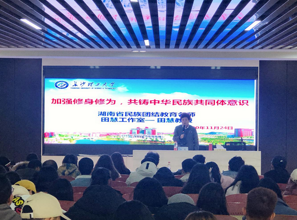 为贯彻学习党的十九届五中全会精神,11月24日下午,学工部邀请湖南省民族团结教育名师、湖南省大学生道德素质提升工程精品项目--田慧工作室--首席专家田慧教授为我校200余名民族学生举行了题为“加强修身修为,共铸中华民族共同体意识”的讲座。我校民族学生教育管理专职辅导员地里努尔、木拉迪以及新疆内派教师热米拉老师参加。