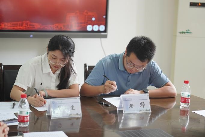 “传帮带”辅导员师徒现场签署结对约定书,正式确立师徒结对关系。指导老师代表、交通学院彭笠代表结合自身工作经验,鼓励新进辅导员坚守育人初心、传承教育家精神,书写属于新时代辅导员的答卷。交通学院李乐天作为新入职辅导员代表作出郑重承诺,将以“空杯心态”虚心求教,以“知行合一”践行所学,以“反哺之心”传递温度,用实际行动诠释担当。