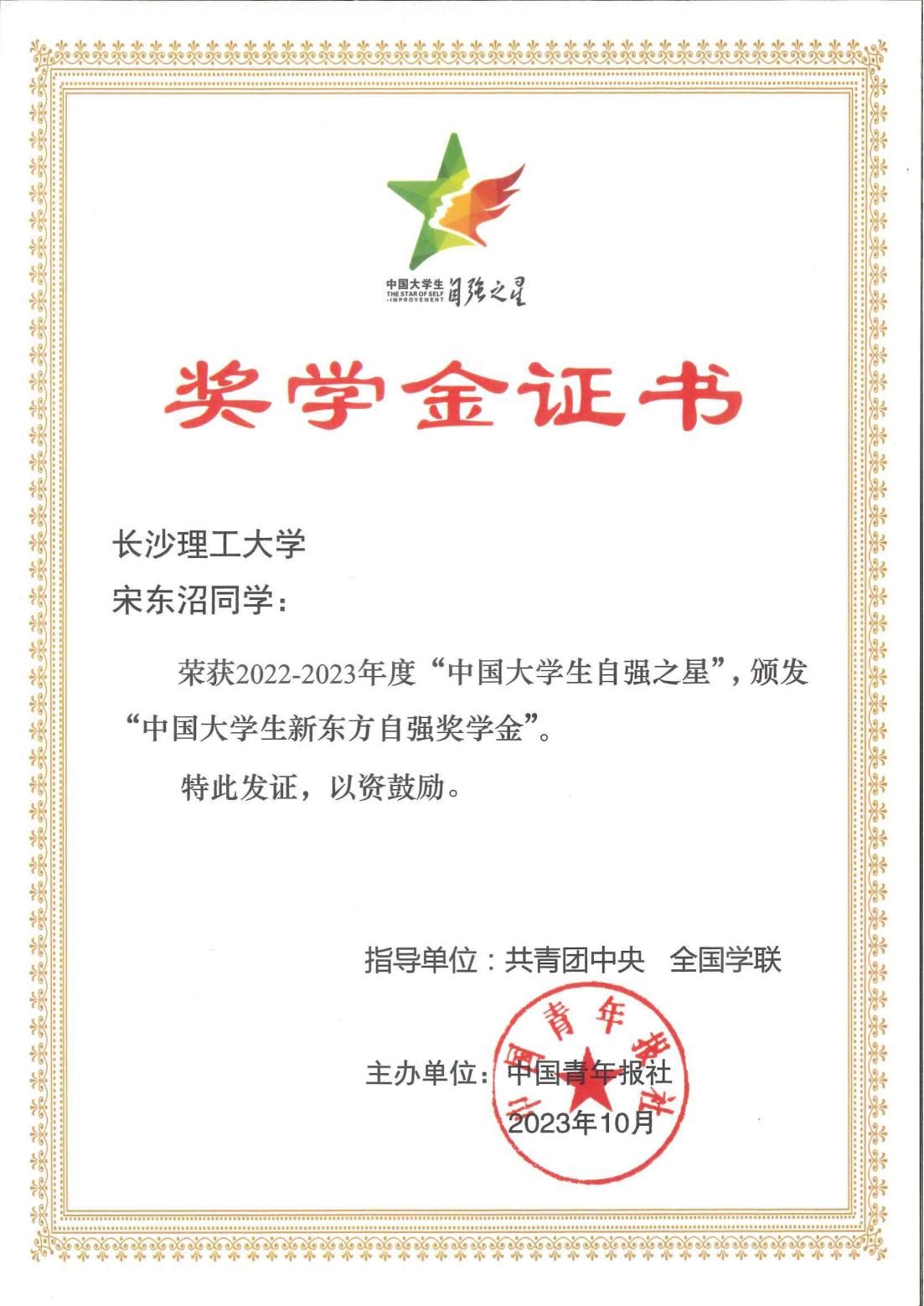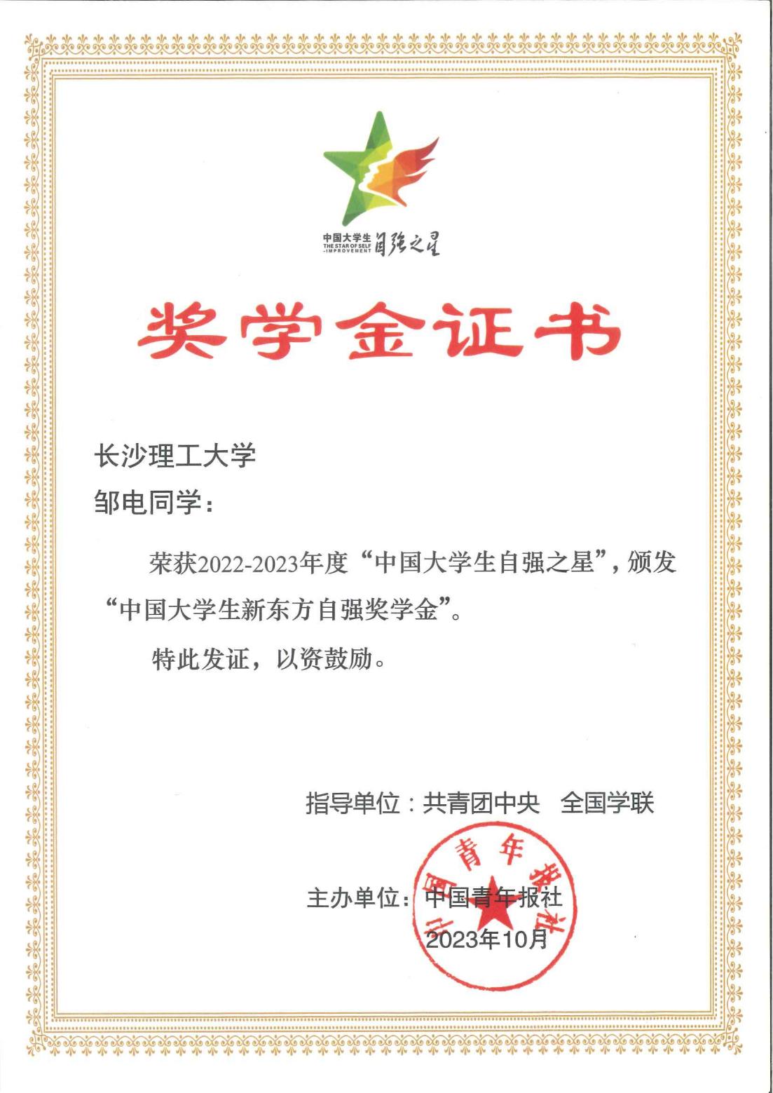 2022年8月20日,由共青团中央、全国学联指导,中国青年报社、新东方教育科技集团、中国青年创业就业基金会联合开展的2022年度“中国大学生自强之星”奖学金推报活动结果揭晓,我校汽机学院2020级本科生宋东沼同学和计通学院2020级研究生邹电同学从众多学子中脱颖而出,荣获2022年度“中国大学生自强之星”。