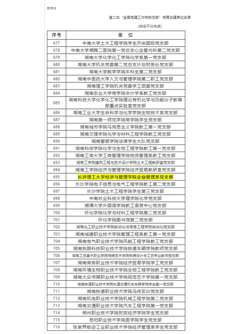 根据《教育部办公厅关于开展第二批新时代高校党建示范创建和质量创优工作的通知》(教思政厅函〔2019〕15号,以下简称《第二批双创工作通知》)安排和评审工作方案,经资格审查、专家推荐、教育部党的建设和全面从严治党工作领导小组成员单位集中审议、结果公示,遴选产生10个高校党委、99个院系党组织、999个党支部分别作为全国党建工作示范高校、标杆院系、样板支部培育创建单位。其中,湖南省高校共有26个党支部获得样板支部培育创建单位,经管学院企业管理系党支部是我校唯一获此殊荣的党支部。