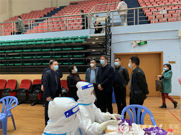 付宏渊一行实地查看了金盆岭校区校门口出入管控和干部值守情况,深入了解幼儿园、子弟学校、西苑食堂等重点区域、重点单位、重点人员的管理排查、防控措施等相关工作落实情况,先后前往教学楼、体育馆、核酸采集点等地查看金盆岭校区师生员工和离退休职工核酸检测现场情况,详细询问了解检查防控医疗保障、后勤保障服务等各项防控工作及民生保障措施落实情况,实地检查校园流动人员、车辆出入管理、各单位值班值守和应急处置预案等工作情况。