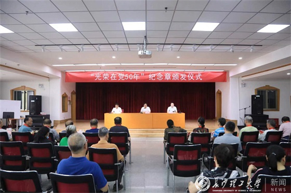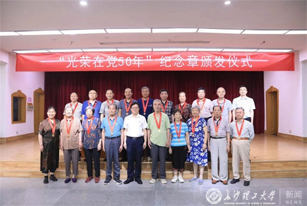 7月5日下午,我校在金盆岭校区五教多功能厅举行“光荣在党50年”纪念章颁发仪式,学校党委副书记刘建民、组织部常务副部长陈曦出席仪式,为24名党龄达到50年的老党员颁发纪念章。仪式由离退休教职工党委书记徐亮主持,部分老同志代表和离退休中心科职以上干部参加。