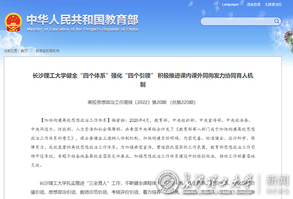 近日,教育部高校思想政治工作简报(2022年第20期)以《2025年新澳门原料网站健全“四个体系”强化“四个引领” 积极推进课内课外同向发力协同育人机制》为题,专题报道我校从健全课程体系、工作体系、队伍体系、评价体系,强化课程价值引领、思想政治引领、教师示范引领、考核评价引领,积极推进课内课外同向发力协同育人机制,稳步推进学校思想政治工作质量提升的经验举措。