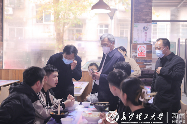 “饺子多少钱一碗?”“在食堂就餐同学们觉得怎么样?”行至东苑餐厅,付宏渊与正在就餐的同学们深入交谈,细致了解同学们的就餐需求与后勤服务水平。“物资储备一定要充足,校内供应一定要畅通,物价水平一定要平稳。”付宏渊以 “三个一定要”强调必须做好校园物资供应与后勤保障工作。当了解到食堂营业时间从早上6点延长至晚上10点确保师生错峰就餐需求时,付宏渊给予了高度评价,他要求相关部门务必坚持以广大师生为中心,用心用情用力切实做好师生后勤服务与保障工作。