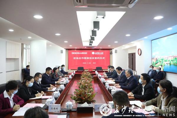 在双方人员的见证下,陈瑜与谈传生代表双方签署了校地合作框架协议。