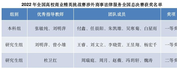 近日,2022年全国高校商业精英挑战赛国际贸易竞赛全国总决赛闭幕。在本次比赛中,由我校法学院本科生与研究生组成的三支队伍在成功入围涉外商事法律服务赛道总决赛,勇夺该赛道一等奖两项、二等奖一项。此次竞赛共有来自全国132所高校的625支队伍参赛,在全国高校14个一等奖中我校荣获两项,这是我校积极回应国家“加快建设涉外法治人才队伍”的要求,着力培养高素质涉外法律人才的集中体现。