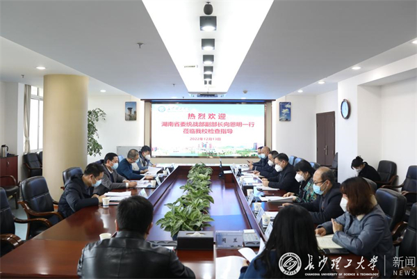 12月13日下午,湖南省委统战部副部长、省民宗委主任向恩明一行来到我校检查指导工作。省委统战部民宗处、宣传处相关同志陪同检查。校党委副书记刘建民,党委委员、副校长蒋璟萍,党政办、统战部、学工部(处)、人事处、保卫部、研究生院、国际处等有关部门负责人参加。