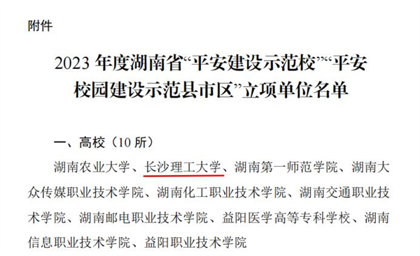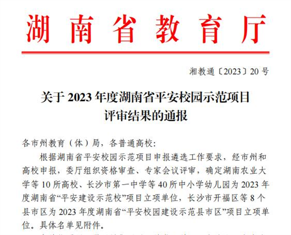 近日,湖南省教育厅发布了《关于2023年度湖南省平安校园示范项目评审结果的通报》,学校获评湖南省“平安建设示范校”项目立项单位。
