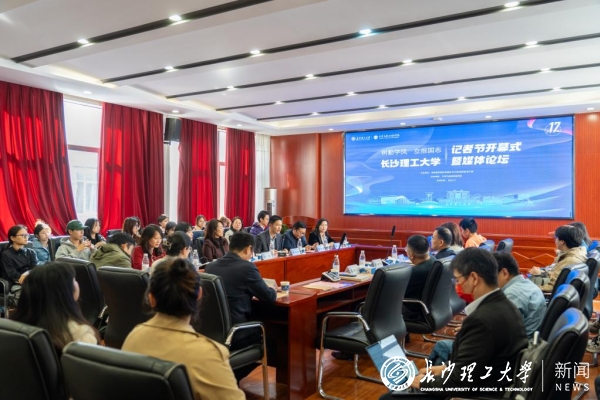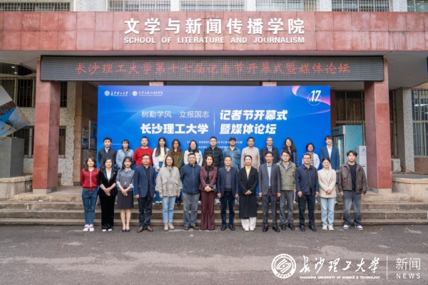 11月4日,在第26个记者节来临之际,我校于金盆岭校区九教218学术报告厅举行第十七届记者节开幕式暨媒体论坛。校党委副书记方琼湖南广播电视台新闻中心副总监高金华、芒果超媒副总编辑易柯明、湖南日报社时政频道副总监湘伴工作室主任邓晶琎学校相关职能部门负责人、文新学院全体院领导和师生代表齐聚一堂,共同探讨产教融合背景下数智新闻人才的培养与创新。