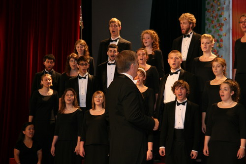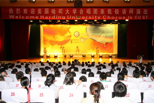 5月27日下午,金盆岭校区5教大礼堂的上空飘荡着空灵、美妙的音符,一场独具文化特色和异域风情的合唱音乐会在这里举行,来自美国哈町大学的大学生合唱团倾情演唱的12首无伴奏中外名曲,为我校师生带来了一场精彩的音乐盛宴。一曲18世纪流传下来的美国民谣《情人渡》拉开了演唱的序幕,飘逸、灵动、通透的歌声让现场的观众听得如醉如痴。合唱团不仅演唱了美国、印度尼西亚、厄瓜多尔等国家著名的经典名曲,还为现场观众带来了《风阳歌》、《茉莉花》等大家耳熟能详的中文歌曲。演唱现场天籁迭起,令人陶醉。中西方文化的交流与融合让音乐超越了国界和民族,美妙的音色与精湛的合声震撼了在场的每一位听众,掌声、叫好声经久不息。最后,合唱团用汉语演唱的三首中国民歌把演出推向高潮,让观众感受到了中外文化艺术的碰撞与交融。此外,我校留学生的《拯救地球》小合唱及阳光艺术团富有民族风格的舞蹈和乐器表演也给在场观众留下了深刻的印象。