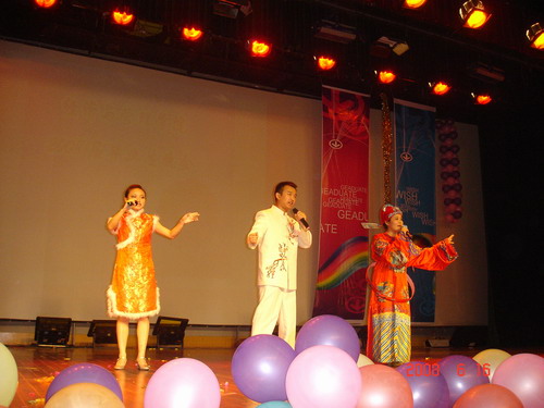 晚会的第一个部分是点歌环节,08届毕业生通过这种方式表达他们对恩师的感激之情,同时,老师和学弟学妹们也表达着他们对毕业生前程的美好祝福。文艺晚会七点正是开始,节目十分精彩,情真意切,感人至深。《炫舞青春》舞出了时代青年的激情和热力;《水姑娘》演绎出了姑娘们的万般风情和青春的旋律;学工办全体老师《我不想说再见》的动情演唱,唱出了对即将离开毕业生的祝愿和不舍;现代舞《舞出人生》表达着青年人的追求时尚和标新立异的性格特征,激情火辣,动感十足;DV+情景剧《永远的画面》是大学四年的一个回顾,从军训开始,把大学生活中的点滴在几分钟内呈现在大家面前,加上煽情的配乐旁白,把离情别绪极大的调动起来了,甚至有些同学感动的热泪盈眶;08年是不平凡的一年,因为奥运会要在首都北京举行,快板《福娃迎奥运》表达了为奥运加油和对北京的美好祝愿……