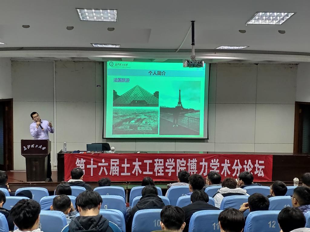 12月3日晚,土木工程学院第十六届博力学术分论坛第十二场讲座于金盆岭校区12教200教室举行。此次论坛由学院戴理朝主讲“锈裂先张混凝土结构预应力损失及承载力研究”,院研会主席王冲主持,到场研究生共计200余人。