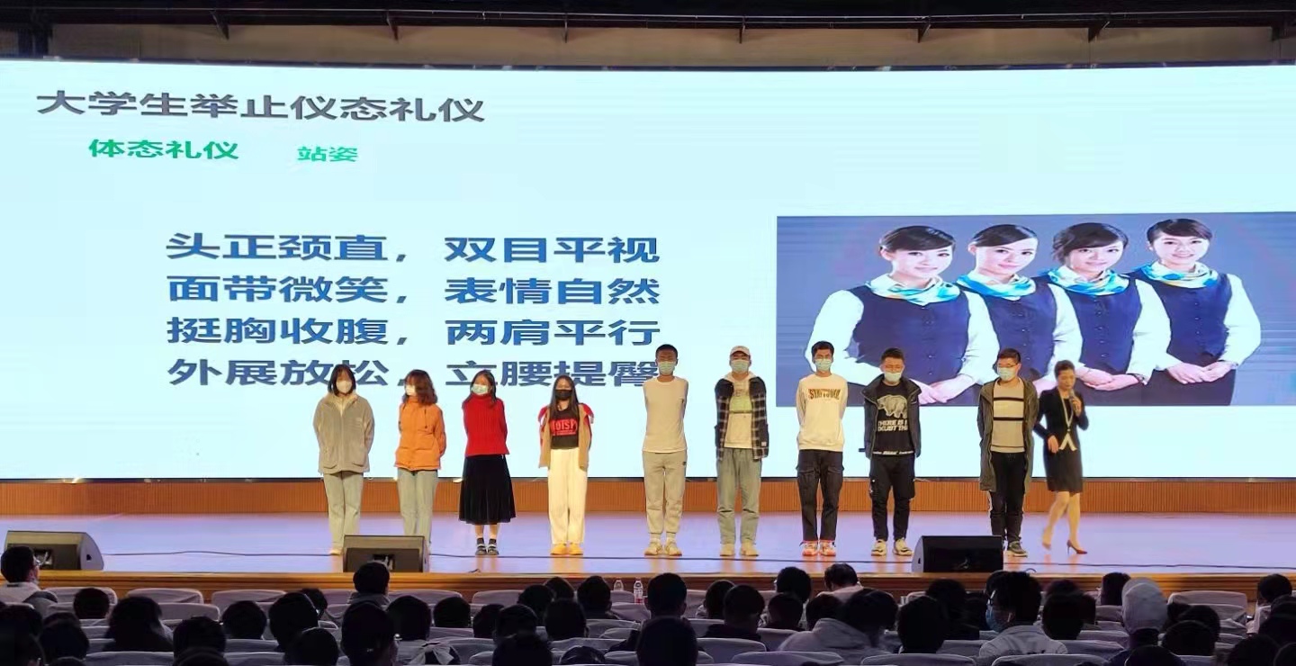 周东喜以当前大学生中部分存在的“受教育没有教养,有知识没有文化”现象为切入点,指出了部分大学生尊重意识淡薄,欠缺谦虚态度;公众意识缺失,不懂分寸;为人处事强势,欠缺容忍雅量;盲目追求时尚,不注重仪容仪礼细节等突出问题,点明了大学生学习礼仪、尊崇礼仪的重要性。她系统的介绍了礼仪的概念,并指出礼仪是尊重他人、尊重自己的一种规范的表现形式,也是人们在社会交往过程中形成的应共同遵守的行为规范和准则。她从大学生的仪容仪表礼仪、举止仪态礼仪、谈吐言论礼仪、电话使用礼仪、校园日常礼仪等五个方面详细的介绍了大学生应具备的各种礼仪,并邀请学生上台手把手指导他们的举止形态。会后,她还贴心地为在场的女生单独讲解了女生在日常生活和社交中应该养成的各种女性礼仪。