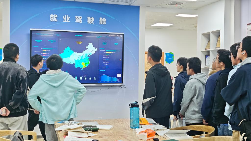 在就业“一站式”服务大厅,讲解员从学校就业工作整体布局入手,介绍了创新创业与就业工作开展情况。同学们现场体验了“就业驾驶舱”大数据平台,通过可视化数据直观了解各专业毕业生的就业流向与发展趋势。AI远程面试间吸引了众多同学驻足体验,大家表示,智能化的就业辅助工具让他们提前感知求职场景,有助于明确方向、早做准备。