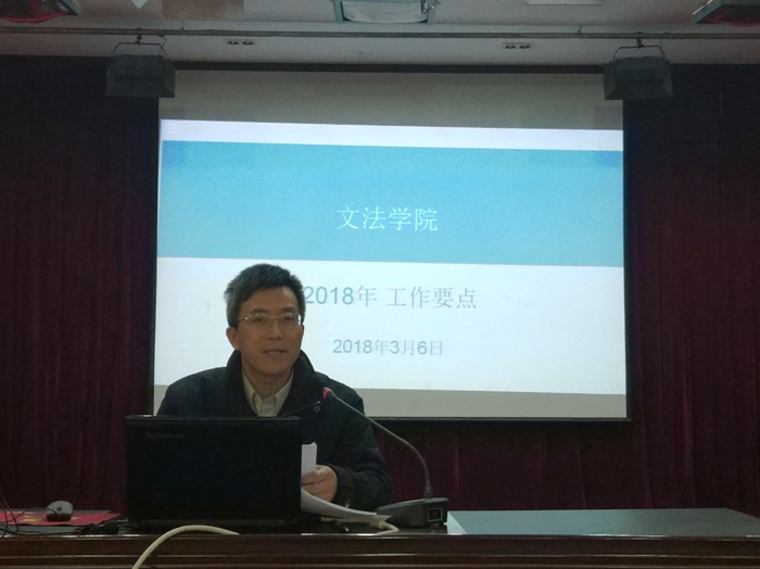 王新生首先传达了学校2018年工作要点,同时对《文法学院2018年工作要点》中5大方面共计27条进行了详细解读。他指出,2018年学院要紧紧围绕“两个导向”开展各项工作,总体要求是:不断加强学习,推动党建工作向前发展;坚持立德树人,强化专业实践,以特色助推,持续提升人才培养质量;对标百强大学目标,打造高质量学科团队,提升学科建设层次;坚持专业特色,完善研究生培养方式;围绕专业定位,打造专业实践活动品牌,优化学生管理工作。