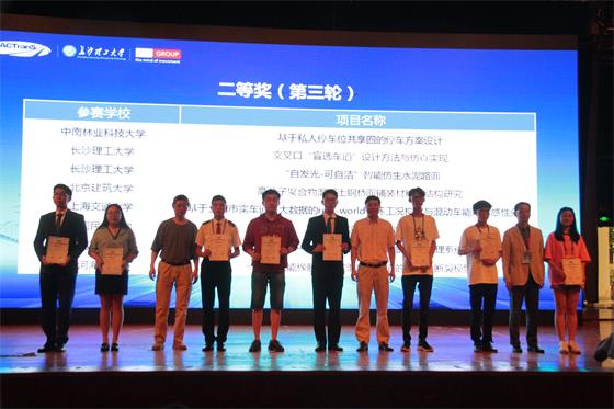 决赛共决出8项一等奖,24项二等奖,32项三等奖。湖南省共有3所高校的8支队伍获奖,其中我校的《“自发光-可自洁”智能仿生水泥路面》、《“鹰眼卫士”—基于视频的机非人实时轨迹提取与冲突预警》、《交叉口“盲选车道”设计方法与仿真实现》、《儿童智能公交卡设计SCC》、《基于Hadoop平台的交通状态识别与预测》五个项目在比赛中再创佳绩,均荣获二等奖,在获奖数量和质量上都取得突破。