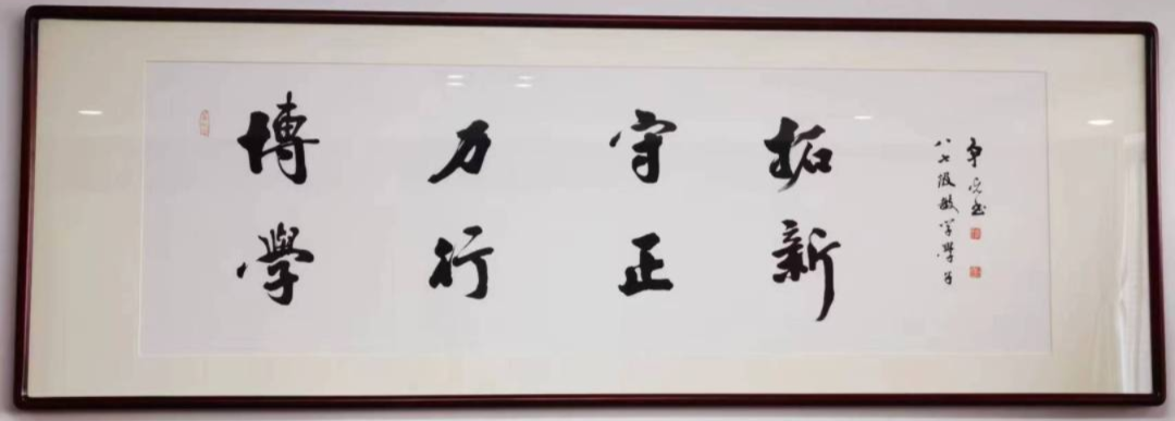 廖争光分享了他创作过程中的点点滴滴,解读他对每一个词的理解和书法特征,他说:毕业32年重返母校,感恩母校的一贯培养和关心,不仅是专业素养的培养,更是综合素质的形成。我想通过母校“校训”书写,寄语在校小师弟师妹们埋头勤学,博采众长;脚踏实地,身体力行;坚持真理,恪守正道;敢为人先,开拓创新。此副字画已在学校会议接待室装裱上墙。