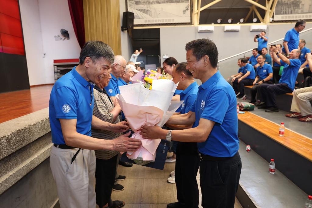 会上,当年从教的14位老教师来到现场,校友代表为老师赠花献礼。“能够参加今天的聚会,没想到还能再次看到他们,我心情非常激动、也非常高兴。”95岁高龄的杨克家老师声音颤抖着说。80岁的文晓明也表达了对学生的热爱和为他们取得的成绩感到骄傲的心情。