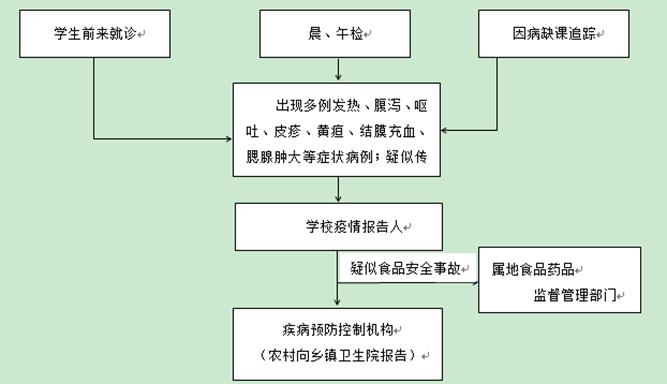 班主任→疫情报告人→疫情报告人排查→校领导→疫情报告人→属地疾病预防控制机构(农村地区可报告乡镇卫生院);若为疑似食品安全事故,同时向属地食品药品监督管理部门报告。乡镇卫生院接到报告后初步核实为聚集性疫情时,应立即上报当地疾病预防控制机构。具体流程见图1。