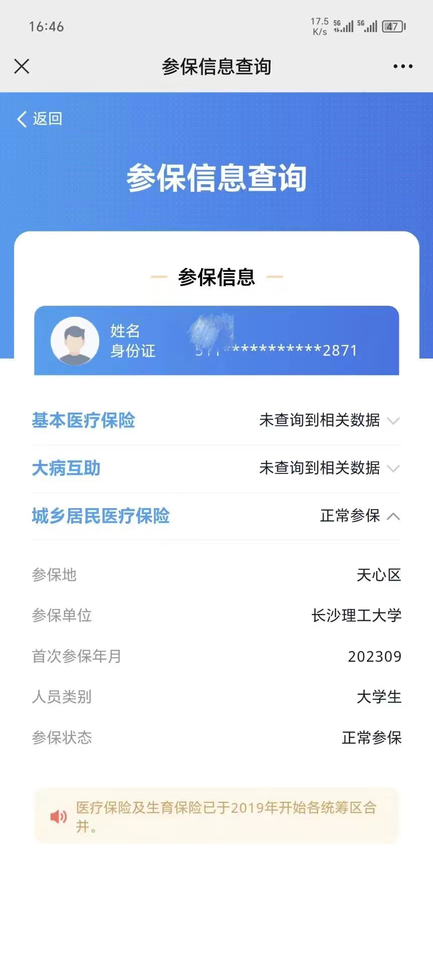 三、查询大学生医保“参保信息”,点击进入后截图可作为参保证明,如用微信登录操作过程中出现一片空白或者别的问题可换用支付宝登录查询