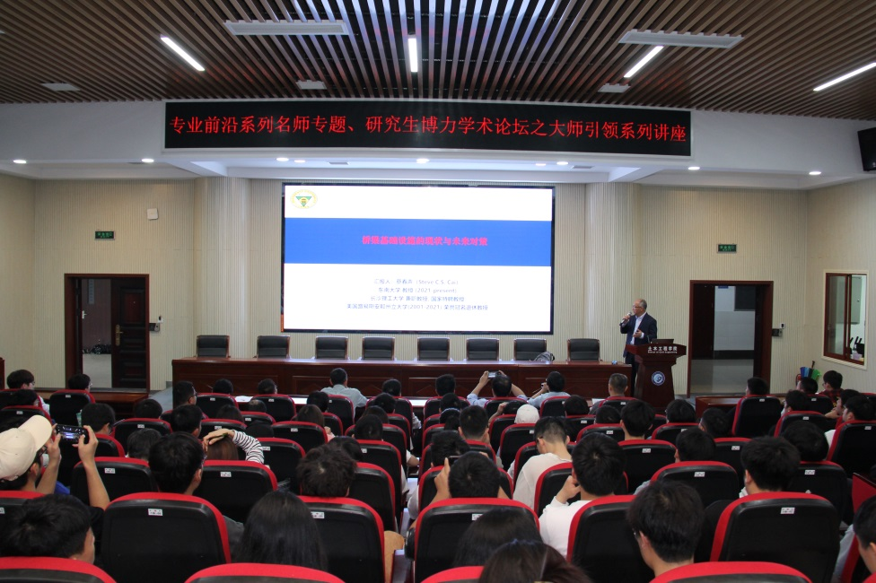 2023年04月18日下午,土木工程学院研究生博力学术论坛之大师引领系列讲座继续在云塘校区工科二号楼B302举行。国家特聘专家、东南大学蔡春声教授应邀做了一场“桥梁基础设施的现状与未来对策”的学术报告。报告由土木工程学院院长王磊教授主持,副院长韩艳教授、蒋田勇教授及200余名教师和研究生聆听了报告。