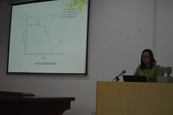 首先,代陈林讲座主题为《中央空调循环冷却水绿色阻垢缓蚀剂的研究》,其内容为针对目前国内外阻垢缓蚀剂存在的不足,开发出一种绿色环保、高效的中央空调复合型阻垢缓蚀剂。紧接着,唐瑶讲座主题为《基于磁纳米粒子对食品基质中双酚A的富集检测方法研究》,主要讲述了磁性纳米技术在食品检测领域中的应用。然后,刘辉讲座主题为《电羧化法固定CO2的研究》,研究内容是寻找到一条清洁环保、能效高、产品利用高的路线,利用CO2作为C资源参与碳循环,减轻“温室效应”的同时也提高了CO2的附加价值。最后,李仙清讲座主题为《硫醇化合物修饰金电极检测重金属离子研究》,主要简介离子选择性电极电位传感器检测汞离子,并与其他检测方法进行综合比较,凸显其优势。