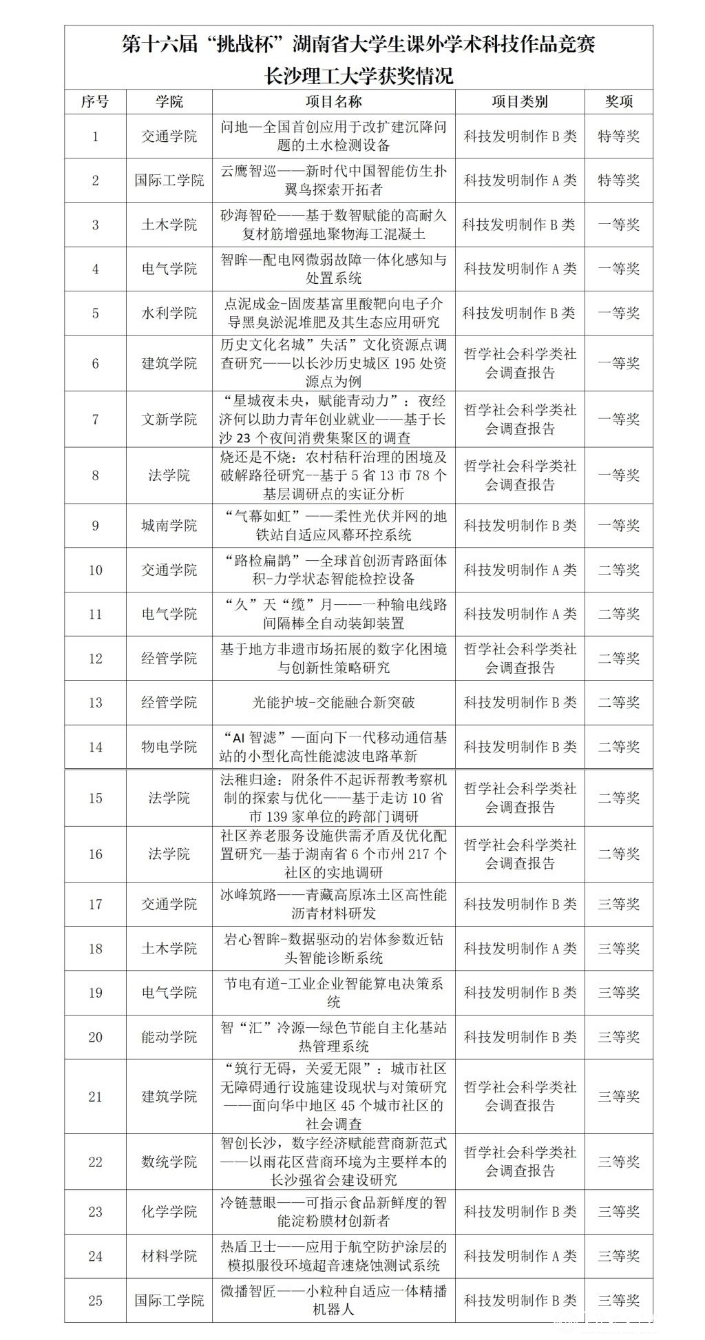 近日,第十六届“挑战杯”湖南省大学生课外学术科技作品竞赛终审决赛落下帷幕。我校参赛团队再创佳绩,斩获特等奖2项、一等奖7项、二等奖7项、三等奖9项优异成绩,获奖项目数居湖南省高校首位,捧得大赛“优胜杯”。