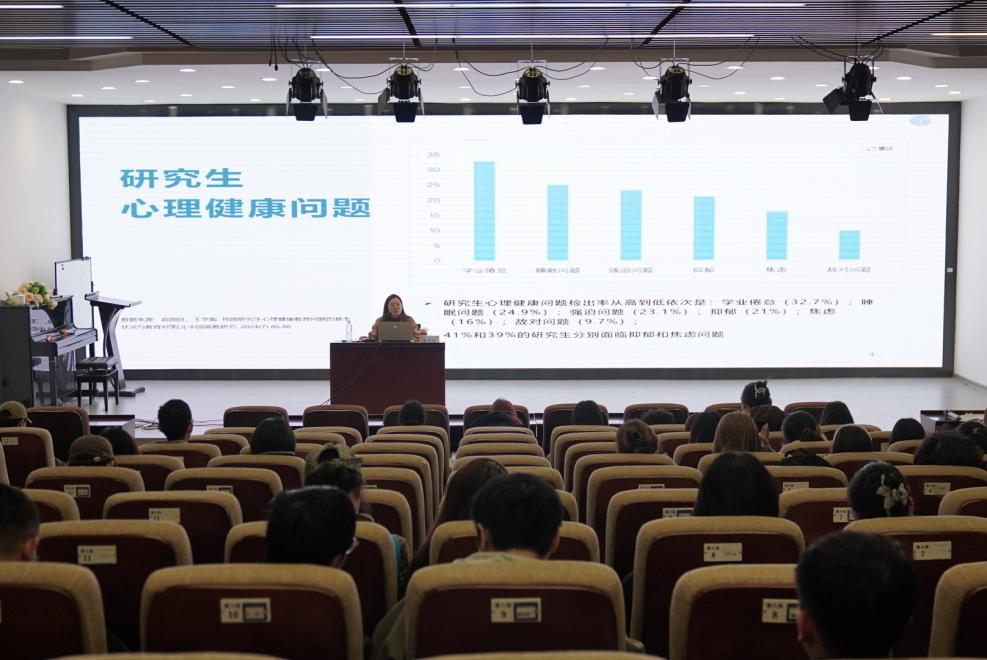 讲座中,曾玮怡老师围绕研究生常见的心理压力问题展开分享,系统剖析了压力的四大来源——学业事件中的课程学习和课题研究、生活事件中的师生关系与人际交往与时间管理、组织环境中的学术劳动力市场竞争和院系文化氛围,以及个人特质高期待和完美主义人格等问题,内容贴合新生实际,引发广泛共鸣。