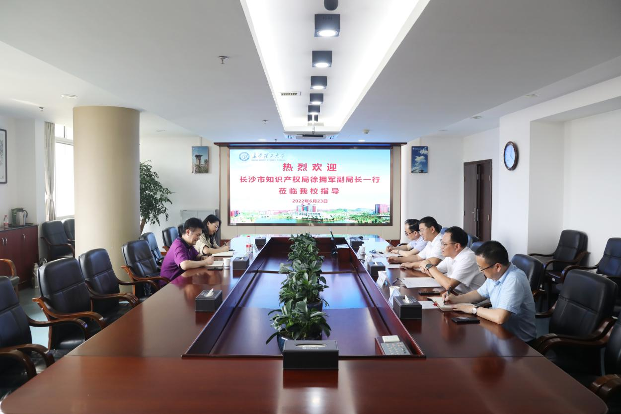 6月23日下午,长沙市知识产权局党组成员、副局长徐拥军等一行来我校调研指导知识产权工作。校长曹一家,副校长刘朝晖,党政办公室、成果转化中心等负责人出席会议。会议由刘朝晖主持。