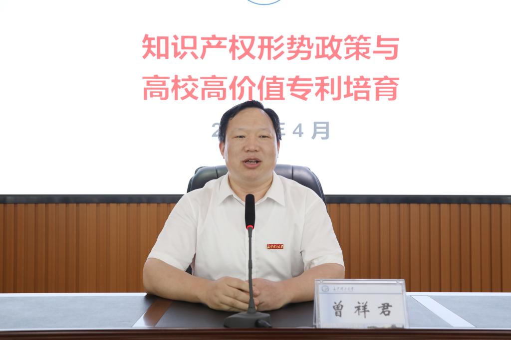 曾祥君致欢迎词。他代表学校对康局长一行表示欢迎,并对长沙市知识产权局对学校的支持表示感谢。他结合自己做科研的经历谈到知识产权及专利的重要性,勉励大家做真科研,出好专利、高价值专利,并做好专利的保护与运用。他指出我校知识产权申请认定工作职责调整至科技成果转移转化中心(知识产权中心),目的就是从知识产权的创造、保护和运用等方面实现全流程管理,并希望通过此次培训提升全校科研人员知识产权创新、保护及转化意识,推动我校知识产权工作高质量发展。