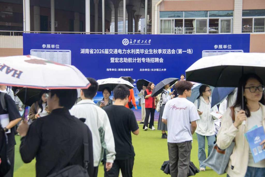 9月20日下午,我校2026届毕业生秋季综合双选会(第一场)暨“宏志助航”计划专场招聘会在金盆岭校区成功举办。此次双选会吸引了来自全国的347家用人单位,为毕业生提供就业岗位近万个,岗位需求涵盖交通、电力、水利、制造、金融、教育、食品、互联网通信、新能源材料等不同行业领域,为毕业生搭建起广阔的就业选择平台。 尤其是作为中国国内规模最大的国有建筑企业和最大的国际工程承包商的中国建筑,此次也组织旗下35家企业参加了本次双选活动。此外广东东莞、广东惠州、江苏泰兴和省内的长沙望城、湘潭等地人社部门也组织了超过80家企业组团参与。