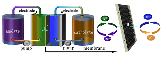 图1 钒电池示意图、TiO2纳米管和Nafion/TiO2纳米管复合膜形貌与结构