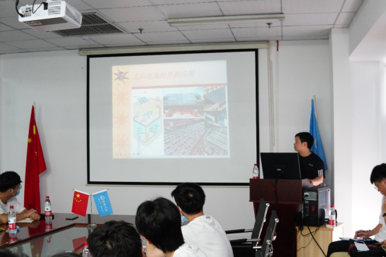 他介绍了太阳电池封装的历史,强调了了解各个流程的注意事项和工艺要求的重要性,图文并茂的讲解方式使学生们对电池的封装、焊接、排列、层叠、层压、边框及接线盒的装配等一系列操作有了初步了解,同时也牢固了学生们的理论知识,为后续的车间参观打好了理论基础。