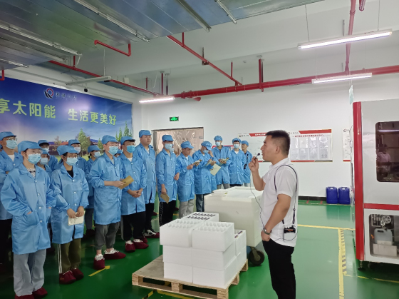 品质主管陈启明向学生们介绍了地面用太阳能电池组件封装制造的具体流程和设备工艺,讲解了“为什么太阳能电池组件需要封装?”。