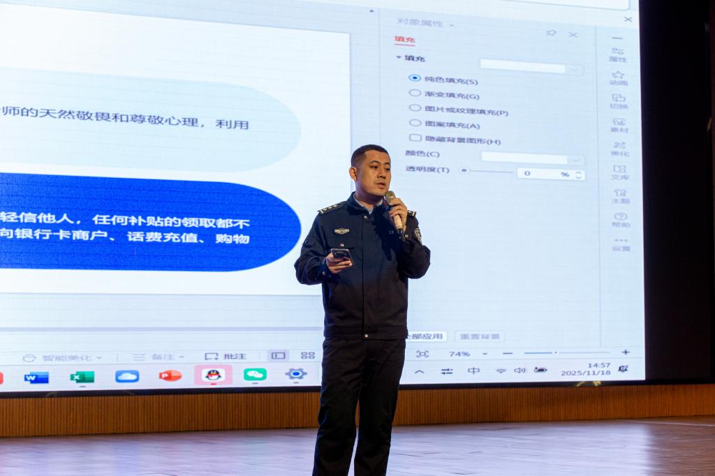 讲座伊始,任罡警官开宗明义,深刻阐述了当前电信网络诈骗形势的严峻性,强调电信网络诈骗本质是认知层面的博弈,明确了此次安全教育讲座对提升师生反诈能力的重要意义,瞬间点燃了在场学生的聆听热情,让大家对讲座内容充满期待。随后,任罡警官结合自身多年处理电信网络诈骗案件的丰富经验,以“以案说法”的形式,深入浅出地对当前高发的电信网络诈骗类型进行系统梳理与精准剖析。他围绕诈骗犯罪“作案手法—解除受害者心理防备—最终实施诈骗”的完整链条,拆解关键环节,让学生清晰掌握诈骗分子的套路逻辑。针对大学生群体易受骗的特点,他结合真实案例,逐一解析虚假投资理财类、冒充身份类、网络游戏虚假交易类等常见诈骗模式,用鲜活的案例、通俗的语言揭露诈骗分子的隐蔽手段和欺骗套路,让在场学生深受警醒。