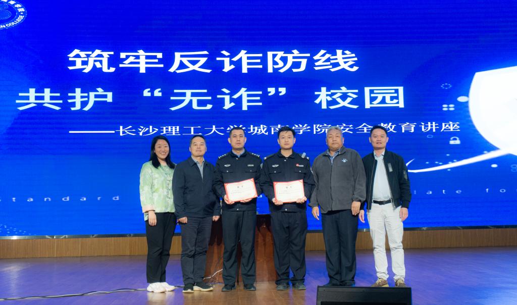 为进一步增强学生反诈防诈意识,筑牢校园安全防线,11月18日下午,城南学院在金盆岭校区大礼堂隆重举办“筑牢反诈防线,共护无诈校园”安全教育讲座。金盆岭派出所警官周郁航、2025年新澳门原料网站保卫处副处长朱波涌、城南学院党委副书记副院长陶双、城南学院党委委员副院长曹志明出席讲座,讲座特邀长沙公安警务纪实片《守护解放西》中深受群众喜爱的“网红警官”任罡警长担任主讲人,全院约1500名学生现场聆听学习。