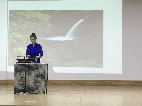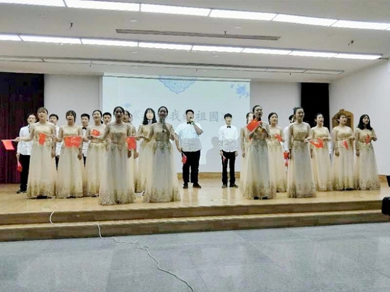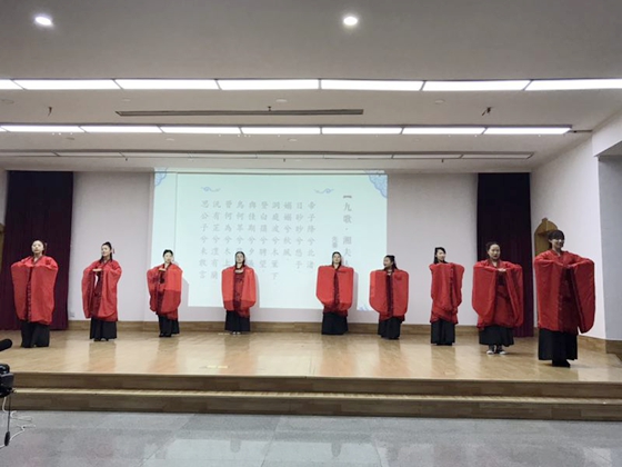 7点30分,晚会正式开始,主持人以屈原“新沐者必弹冠,新浴者必振衣;安能以身之察察,受物之汶汶者乎?宁赴湘流,葬于江鱼之腹中。安能以皓皓之白,而蒙世俗之尘埃乎?”的千古一问开场,很有特色。一群小书童从一个独特的视角,通过生动形象的故事情节演绎着诗经《木瓜》;诗词联诵《古朗月行、游子吟、一东》、《端午即事》、《传统武术》等节目中,孩子们清脆的童声,可爱的模样赢得台下阵阵掌声和笑声;蒋步云的色空鼓《云水禅心》,让人顿忘烦恼,只觉心旷神怡;文法学院晏雯、盛胜龙表演的《醉花阴》,张彤吟唱范仲淹的《苏幕遮》,让人不得不感叹于诗词的美;《离骚》、《湘夫人》、《屈原》等电影配音让大家享受一把穿越时空,看到了三闾大夫的家国情怀;城南学院表演的《我和我的祖国》气势恢弘,把晚会推向了高潮,在场师生都不知不觉融入这歌声里,那句“我和我的祖国,一刻也不能分割!无论我走到哪里,都流出一首赞歌。”一直在耳边回响。