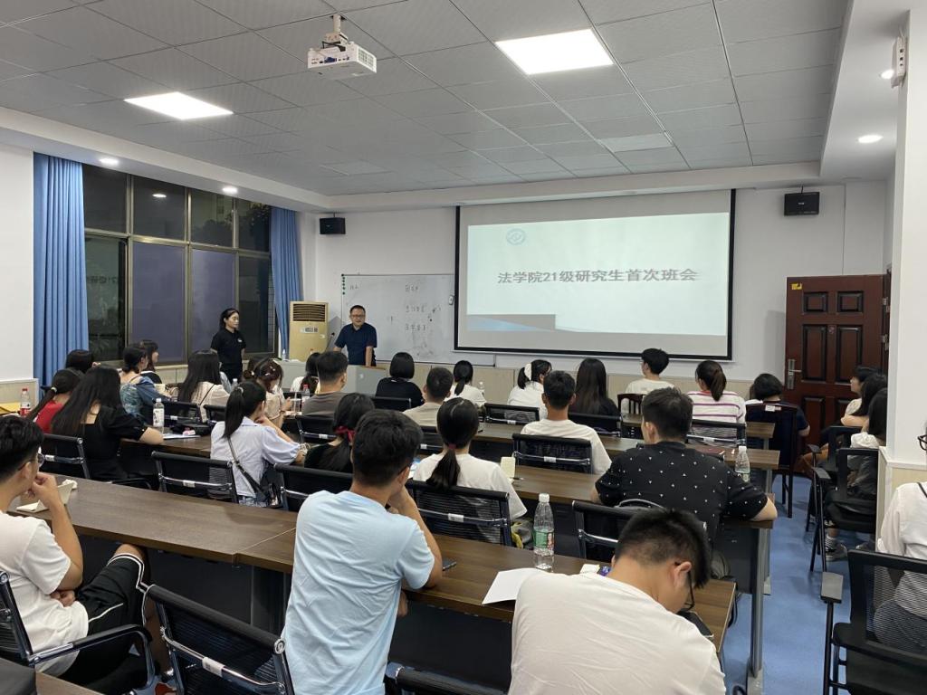 9月6日晚,法学院2021级硕士研究生首次班会在金盆岭校区七号教学楼319教室顺利召开。法学院党总支副书记兼副院长汪功伟、21级研究生班主任杜卫红出席了本次会议,法学院2021级全体研究生参加了本次会议。