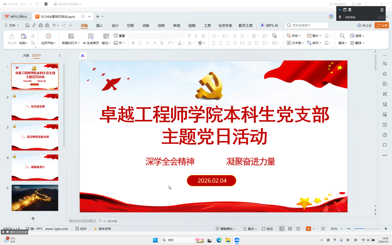 会上,冯子桐同志首先主讲微党课,带领全体成员系统学习了习近平总书记2026新年贺词的内容及其在中共中央政治局民主生活会上的讲话内容,并结合学生党员学习、工作、生活实际,提出了对如何贯彻落实有关讲话精神的思考和建议,从纪律执行、服务担当、工程报国等方面号召全体党员自觉主动担当作为,将个人奋斗融入党组织的事业中。