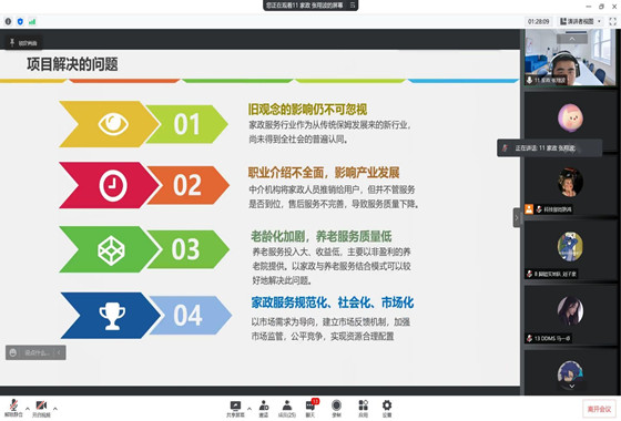 此次线上答辩评审分三个会场同步进行。各团队有序展示项目PPT,严格遵守比赛要求,认真回答老师问题,虚心听取老师意见。各评委老师针对不同项目指出了项目存在的缺陷和不足,提出了改善建议,并给予鼓励。评审中,部分项目缺少市场调研,老师们指出对此问题,应制定相应商业计划、研究服务对象方法,进一步分析需求、考虑成本;还有部分项目应该落实市场需求,不应只是以兴趣确立选题。除了项目内容,评委老师对ppt制作质量和答辩语言的流畅度也提出了要求。经过一下午激烈的角逐,比赛圆满落幕,评委老师对各项目组进行了打分。