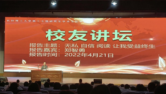 4月21日晚,电气学院于金盆岭校区五教大礼堂举办第十七届研究生学术文化节系列活动之校友职业生涯讲坛。邀请长沙科智防雷工程有限公司董事长郑智勇校友作主讲嘉宾,电气学院党委副书记任艮丰,辅导员王迪、张一鸣,2021级全体本科生、研究生参加。