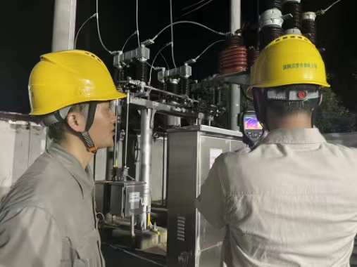 在师傅的耐心讲解下,实践队员们对变电站主变、电流和电压互感器、断路器、隔离开关、继电保护装置等一二次设备进行了认识和学习,并对变电站蓄电池内阻进行了测量。入夜后,实践队员们跟随师傅对设备进行测温,学习如何利用专业工具对变电站内的关键设备进行温度监测。这不仅是预防设备过热引发故障的重要措施,也是保障电网安全稳定运行的关键一环。在三个小时的测温过程中,师傅还向实践队员们讲解了变电站避雷针、避雷器、避雷线等防雷设备的相关知识,丰富队员们变电站运行和防雷等方面的知识储备。