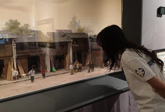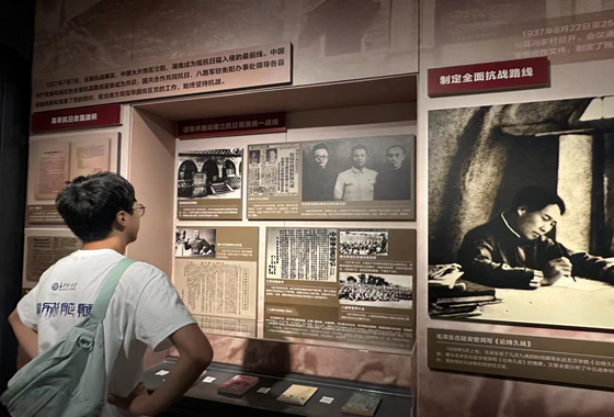 身戴团徽、心念忠烈。刚踏进馆内,醒目的“血染衡岳”主题雕塑伫立在馆厅正中央。实践队员们走近观看,雕塑上刻画的是1944年的衡阳保卫战中浴血奋战、冲锋陷阵的战士们。转角,队员们来到四个主题展厅,分别是“战略、大义、悲壮、英雄”之城。在这里,不断重复播放着衡阳保卫战的纪录片,墙上挂着一把把战士们抵抗时所用的长刀、手雷。陈列馆里整齐摆放着英雄们所遗留下的笔记、书籍。实践队员们仔细的看着每一件物品、读着它们的故事。