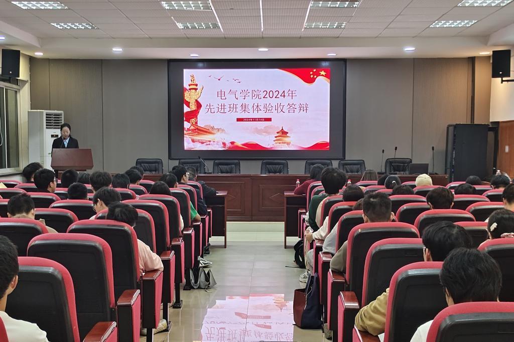 1114日晚,电气学院于云塘校区工科一号楼B503举办2024年先进班集体验收评比答辩。电气学院党委副书记周巍、2023级辅导员熊文娟、2022级辅导员吴佳骐、2021级辅导员张一鸣、各班学生代表参会。