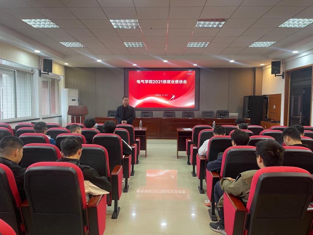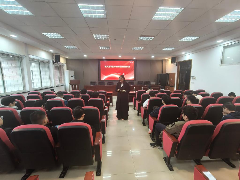 1121日电气学院在工一B503召开毕业生就业座谈会,电气学院党委副书记周巍,就业中心主任欧彩玲,毕业生辅导员田孟萍、张一鸣,未就业毕业生参会。