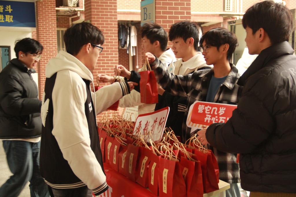 礼包包含水果、零食、牛奶以及由老师和同学手写满载祝福的暖心明信片等,每个礼包袋上都写有“前程似锦”、“成功上岸”等美好寓意的字样,伴随礼包的还有领导老师同学们最温暖的祝福和加油,为考研学子缓解备考压力同时提振信心。