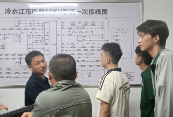 电网技术部实践队员结合“冷水江市电网10kv系统一次接线图”,了解了供电公司各级输电结构、主线支线以及输电系统的取名规则、变电站的分类等内容。此外,师傅还以具体案例为例,向实践队员们完善讲解安全工作规范,防止因操作不当产生安全事故。