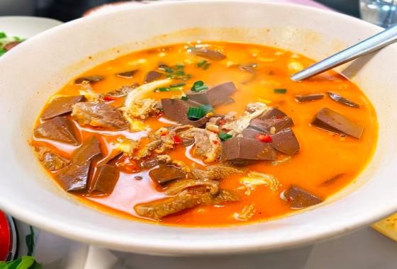 新化三合汤以牛肉、牛血、牛肚为主料,经辣椒烹煮而成,兼具麻、辣、鲜、香风味。实践队员们在品尝过程中纷纷表示,能感受到麻辣鲜香瞬间在舌尖炸开。队员郭永强赞叹道"三合汤的麻辣鲜香在舌尖绽放,汤底醇厚浓郁,不愧是地方美食代表。"。