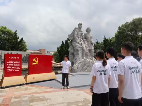 在纪念馆广场的党旗前,预备党员高驭韬借阿庆嫂智斗刁德一的故事给实践队员们开展了一堂微党课。“‘坚定不移的斗争意志,军民同心的鱼水情深,沙家浜精神是战火中淬炼的信仰之光,更是穿越时空的精神火炬。高驭韬的一番话让队员们频频点头,现场掌声阵阵。